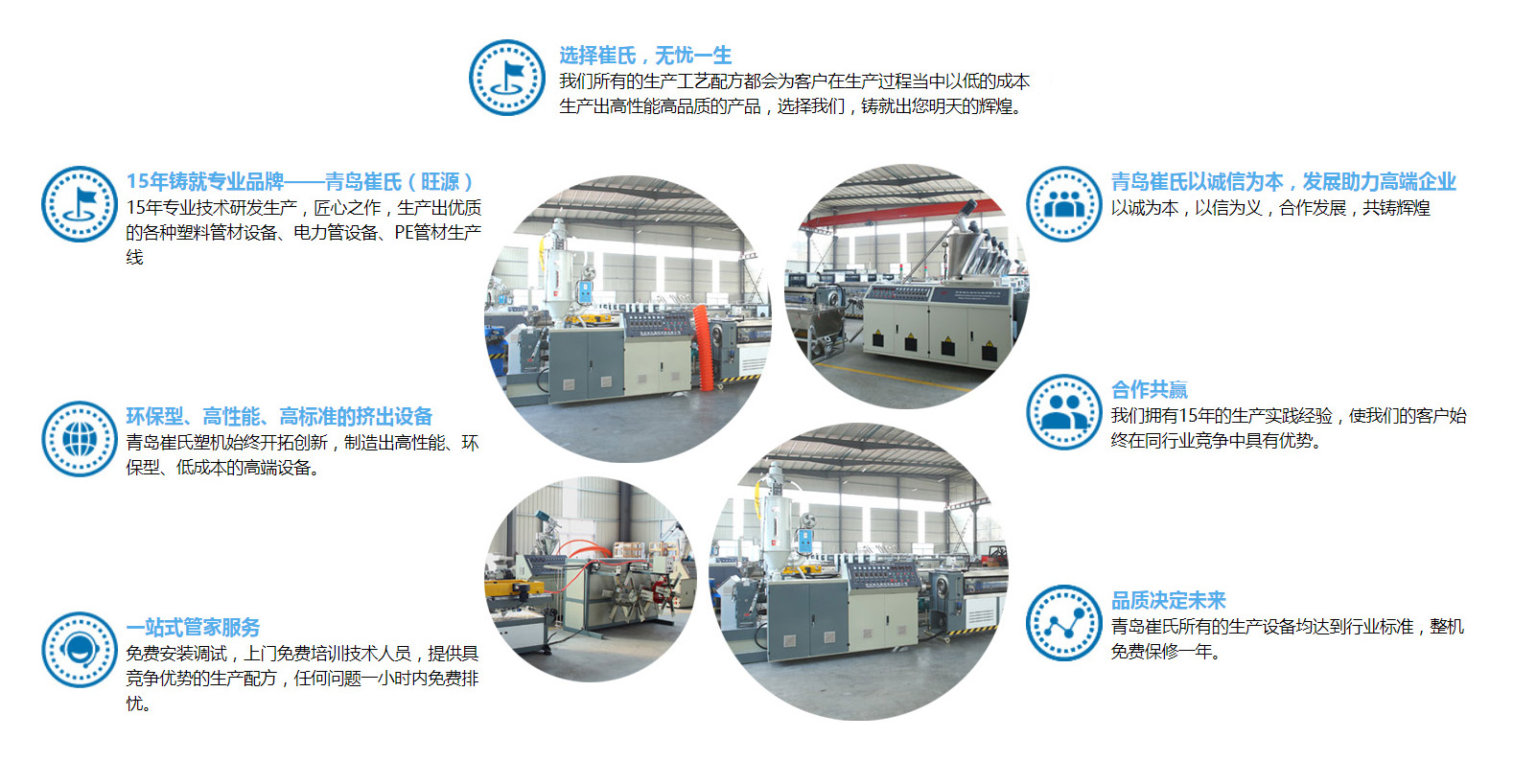 青島崔氏塑料機(jī)械:生產(chǎn)的預(yù)應(yīng)力塑料波紋管設(shè)備、電力管設(shè)備、塑料波紋管設(shè)備、汽車(chē)線(xiàn)束波紋管設(shè)備、PPR、PE、PVC、PERT管材設(shè)備及其它各種管材設(shè)備、塑料型材設(shè)備、塑料蜂窩板設(shè)備, 遠(yuǎn)銷(xiāo):歐州,獨(dú)聯(lián)體,南美洲,中東,東南亞,大洋州,非洲等地的20多個(gè)國(guó)家和地區(qū)。